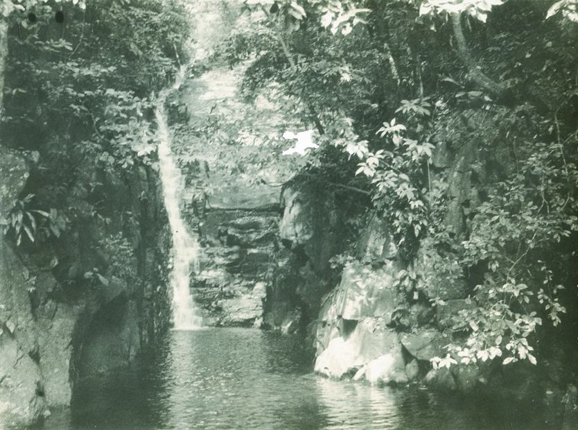 Chegando lá, eu [] o ambiente comum a uma cachoeira. Se via ao fundo uma cachoeira que não é grande, é uma cachoeira que não chega nem... é uma fração do que fosse a nossa cascatinha aqui do Alto da Boa Vista. É uma quedazinha d’água de mais ou menos uma altura de uns 12 metros, se tanto, e que vem cair num reservatório de água, de mais ou menos uns 12 metros de largura, pra quem olha de frente, por mais ou menos uns trinta e poucos ou 40 de fundo, que vai até o pé da cachoeira.