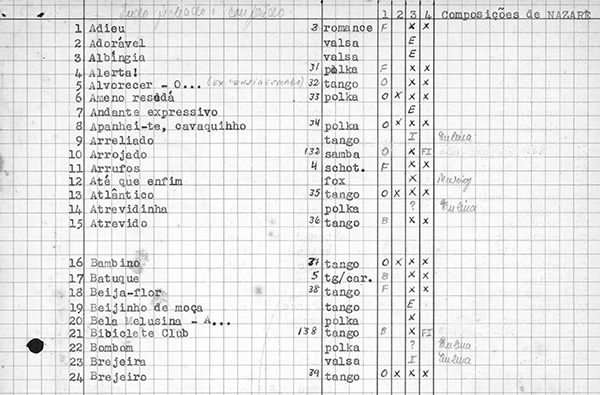 Em primeiro lugar, chama a atenção uma tabela datilografada listando a obra completa de Nazareth em ordem alfabética, classificando uma a uma como “fraca”, “boa” ou “ótima”. Colunas subsequentes indicam se Jacob já as havia transcrito para bandolim, se a peça havia sido editada, e se ele possuía a partitura impressa para piano.