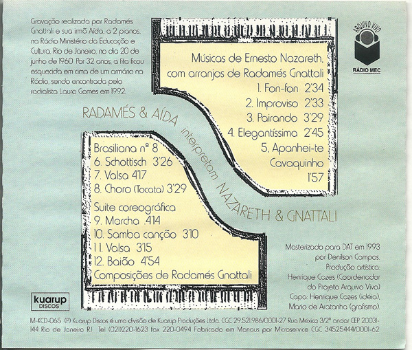 Capa e contracapa do CD “Radamés e Aída Gnattali interpretando Nazareth e Gnattali” (Kuarup M-KCD-065)