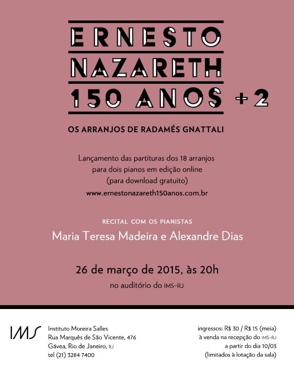 E-flyer do concerto Ernesto Nazareth 150 + 2: Os arranjos de Radamés Gnattali, que ocorreu no Instituto Moreira Salles no dia 26 de março de 2015