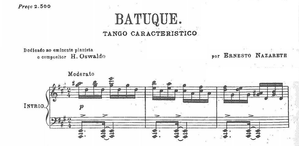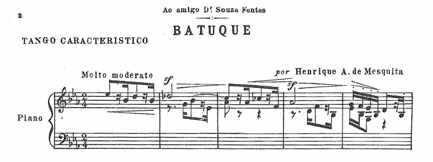 Por exemplo, o famoso “Batuque” de Mesquita, publicado em 1894 com o subtítulo “tango característico”, parece ter servido de inspiração para a música de mesmo título e mesmo subtítulo que Nazareth começaria a compor em 1901, e que se tornaria uma de suas obras-primas.