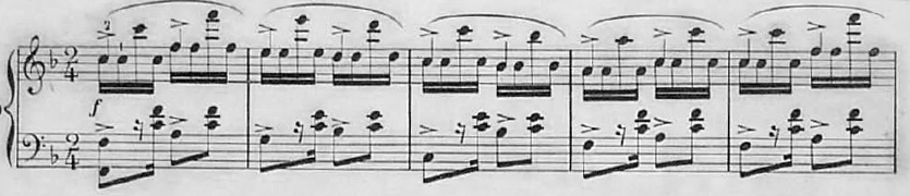 Trechos da polca “Cruz, Perigo!!” de Ernesto Nazareth, e da "Rapsódia Húngara No.2" de Franz Liszt, em que se utiliza a mesma técnica na mão direita.