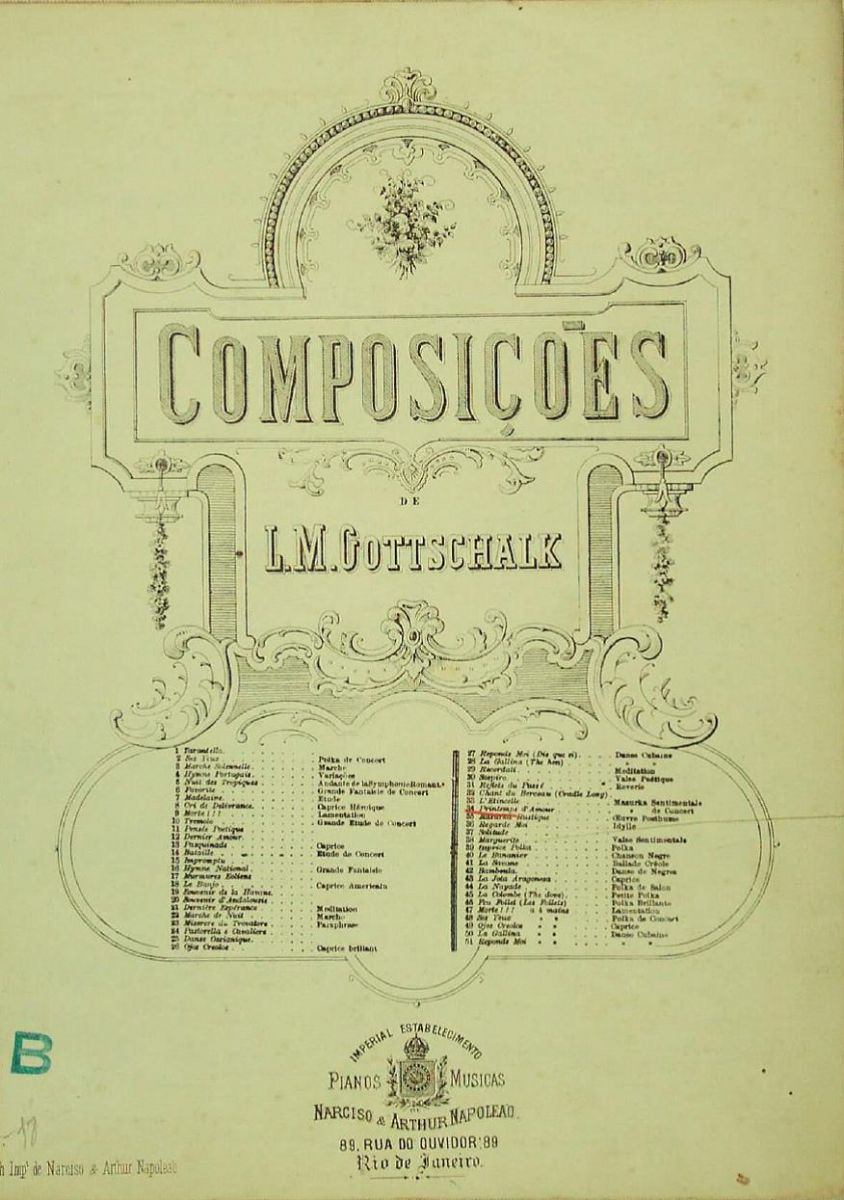 Pelo menos 51 peças de Gottschalk eram vendidas no Rio de Janeiro pela editora Narciso & Arthur Napoleão, o que o torna possivelmente o compositor estrangeiro com mais obras publicadas no Brasil durante o século XIX.